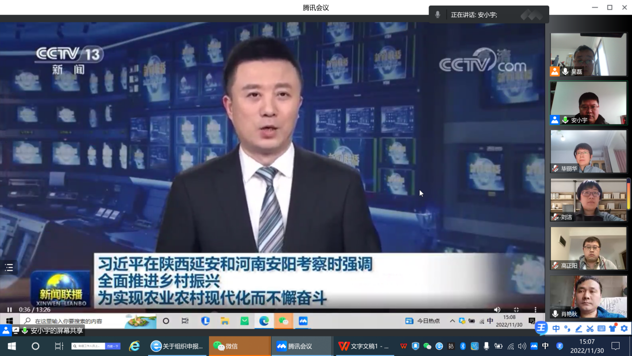 11月30日下午,机关党委学科建设办公室党支部线上召开了“深入学习习近平总书记视察安阳重要讲话精神,大力弘扬红旗渠精神”专题组织生活会,学科建设办公室党支部全体党员参加,会议由支部书记安小宇主持。