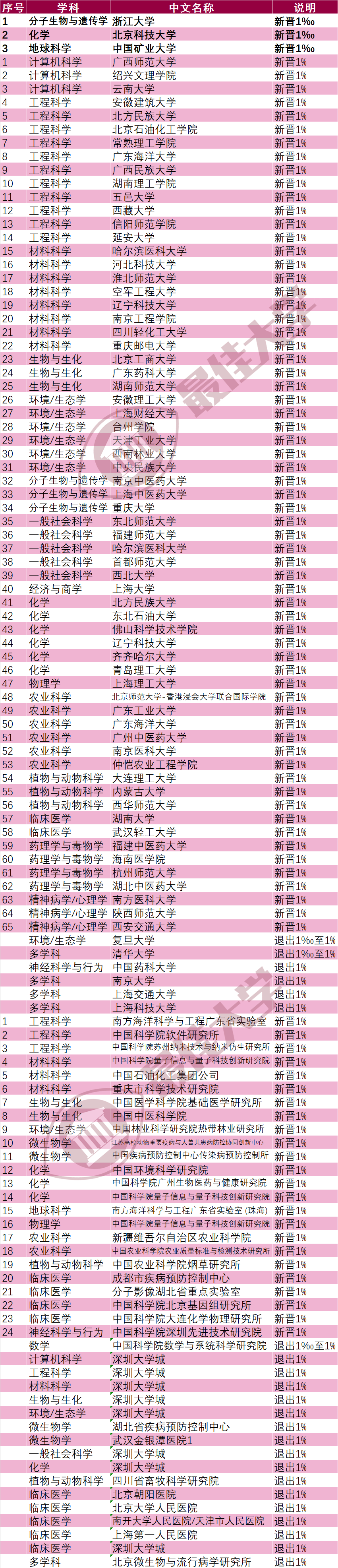 本次中国大陆一共428所高校有学科进入全球前1%,其中新增10所,无退出。新增高校为:延安大学、常熟理工学院、齐齐哈尔大学、广西民族大学、北方民族大学、安徽建筑大学、西藏大学、北京石油化工学院、湖南理工学院、北京师范大学-香港浸会大学联合国际学院。
