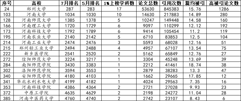 本次河南高校学科变化情况中,信阳师范大学工程科学新晋全球前1%学科。